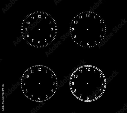 Mechanical clock faces with arabic numerals, bezel. Timer or stopwatch element. Mechanical clock face dials template set. Classic clocks and watches with arabic and roman numerals for your own design