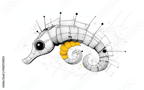 seahorse, mechanical, artistic, design, illustration, vignetting, drawing, whimsical, unique, creative, animal, fish, marin, ocean, underwater, modern, geometric, line, grey, white, yellow, detail, intricate, complex, futuristic, fantasy, digital, ink, pen, art, concept, abstract, contemporary, cute, adorable, quirky, bold, dynamic, industrial, engine, metal
