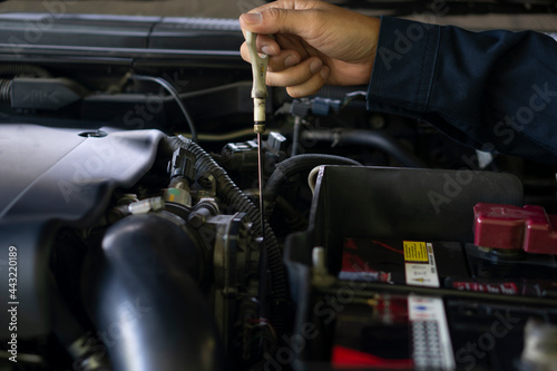 Mechanic's hand reaches the point of checking the engine oil level from the engine.