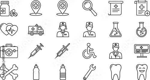 medicals, health care, doctor, nurse, patient, hospital, clinic, ambulance, emergency, medicine, syringe, injection, pharmacy, treatment, diagnosis, therapy, health, care, disability, wheelchair, equipment, first aid, cross, icon, outline, minimal, vector, illustration, design, symbol