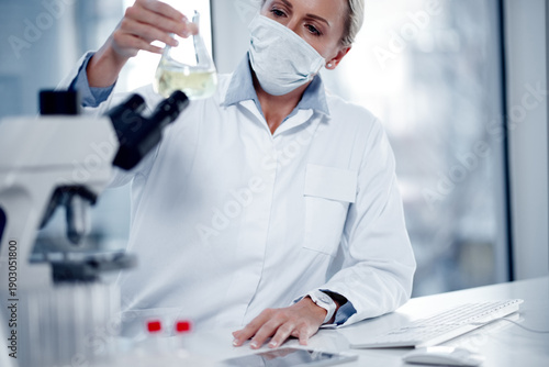 Medical, beaker or woman in lab with mask, biotechnology or fluid exam in vaccine development. Inspection, test or scientist in clinic with sample, research or analysis in pharmaceutical study.