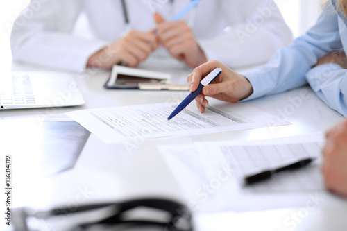 Medical doctor and young couple patients discussing something at the table . Hands close-up