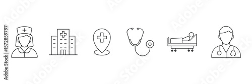Medical line icon set. Containing doctor, stethoscope, medicine, hospital, treatment, healthcare, nurse, pills, thermometer, syringe, clinic and more. Vector illustration.