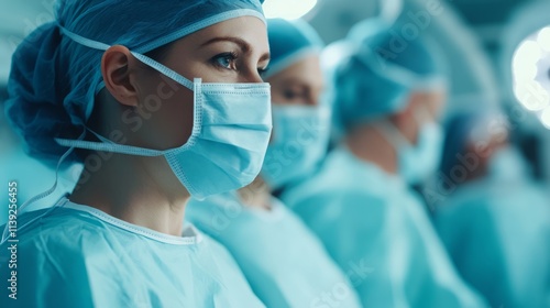 Medical Team in Surgical Masks and Scrubs Awaiting Procedures in a Bright Operating Room Environment, Symbolizing Healthcare and Teamwork