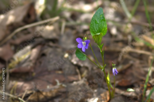 Medicinal plants. Wild violet viola in spring in the forest. The background is blurred