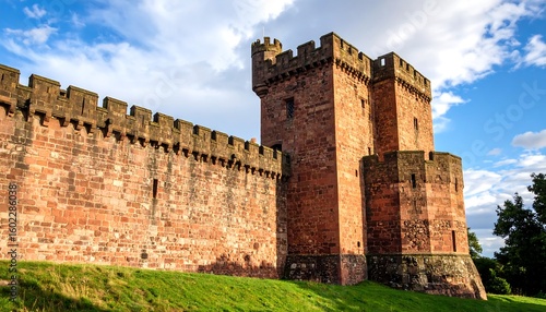 castle, tower, wall, stone, red, mediaeval, fortress, defense, ancient, ruin, history, architecture, europa, sky, cloud, sunny, light, landscape, green, grass, hill, elevated, view, exterior, structure, fortification, citadel, strong, imposing, grand, majestic, brick, detail, sunlight, shadow, nature, old, tour tourism, landmark, travel, sightseeing, heritage, european, fort, blood-red