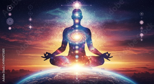 figure, meditate, galaxy, space, universe, sky, sunset, bright, calm, serene, earth, planet, circle, symbol, cosmos, human, silhouette, arm, hand, leg, energy, chakra, light, spiritual, calmness, wellness, peace, awareness, meditation, relaxation, background, poster, illustration