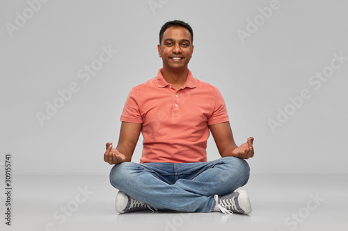meditation, mindfulness and people concept - happy indian mant meditating in lotus yoga pose over gray background