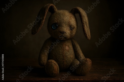 Melancholy Portrait of a Worn Vintage Stuffed Rabbit with One Button Eye