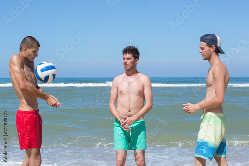 man, beach, ball, fun, sea, sport, young, summer, enjoying, people, caucasian, background, fit, active, 20s, vacation, action, sportsman, sky, smile, healthy, teenage, teenage, together, 20s, three, torso, sunshine, recreation