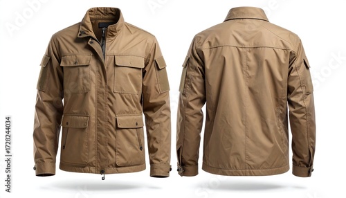 jacket, coat, outerwear, apparel, clothing, male, fashion, style, tan, khaki, brown, beige, neutral, fabric, textile, material, cotton, polyester, nylon, casual attire, utility, field, military, tactical, pocket, zip, buttons, collar, sleeve, cuff, front, back, view, studio, white, background, product, merchandise, garment, wear, autumn, fall, spring, winter, layer, protection, warmth