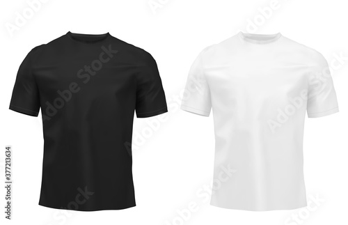 Men's white and black t-shirt with short sleeve mockup. Front view. Vector template. Isolated on white background.