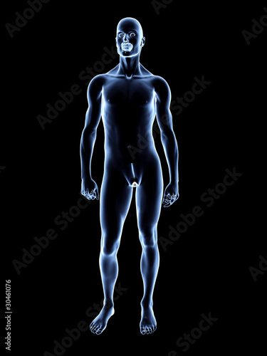 three-dimensional, graphic, illustration, body, anatomy, man, human, man, naked, banner, medicative, science, studying, glasses, roentgen, x-ray, head, shoulder, upper body, leg, arm, hand, finger, neck, muscle, standing, aspect, diagnostic