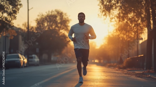 Mental Health Boost: Middle-aged Hispanic Man Jogging in Urban Sunrise, Promoting Exercise for Well-being