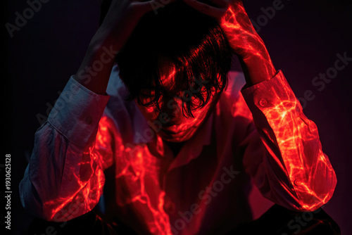 Mental Stress and Anxiety: Person with Red Fractured Light Patterns