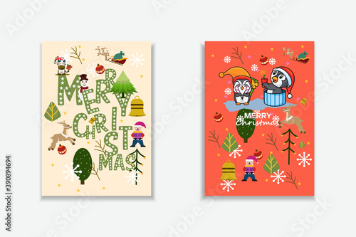 Merry Christmas Vector trendy abstract illustrations of holiday card with forest, santa claus, deer, lettering, christmas tree and pine. Drawing for poster or pattern.