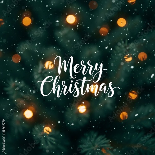 Merry Christmas text on a green spruce tree background with sparkling lights. Holiday season celebration concept for greeting card and festive design.