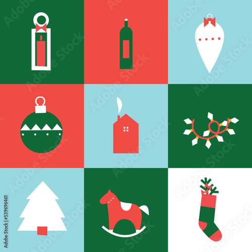 Merry Christmas vector flat icons. Set for covers, invitations, posters, banners, flyers, illustration. Minimal template design for branding, advertising with winter Christmas composition.
