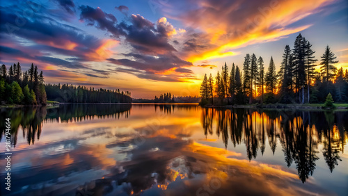 Mesmerizing sunset reflection on tranquil lake with silhouetted evergreen forest , sunset, reflection, tranquil, lake