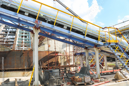Metal iron structures, industrial production with a conveyor, pipes, railings and pipelines at the production of an oil refining petrochemical plant