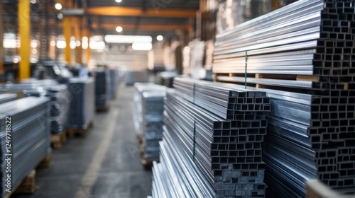 Metal Profiles Stacked in a Warehouse. Industrial Storage of Steel Products.