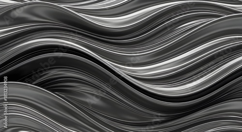 Metallic fluid waves frozen mid-motion, molten-like texture with seamless reflective highlights, deep soft shadows, elegant curves, monochromatic palette, luxury-brand aesthetic