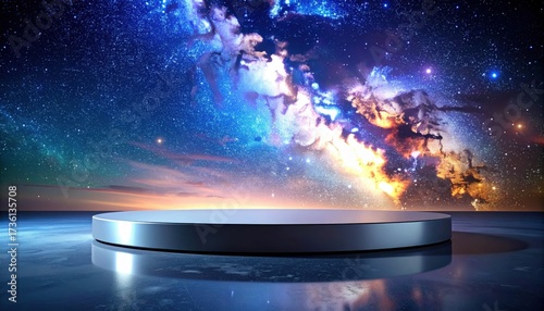 Metallic Platform under Cosmic Sky Displaying Galaxy and Stars with Ambient Lighting