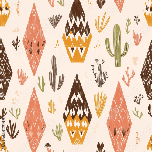 Mexican desert pattern with cacti, abstract geometric shapes and tribal inspired background