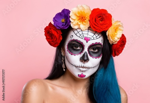 Mexican holiday of the Halloween. a Woman with sugar skull makeup and flowers