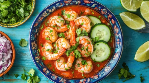 Mexican shrimp cocktail featuring fresh shrimp in a tasty tomato sauce accompanied by cucumbers onions lime juice and cilantro against a vibrant blue backdrop