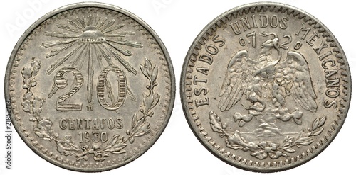Mexico Mexican silver coin 20 twenty centavos 1930, value flanked by oak and laurel springs, liberty cap with rays above, eagle on cactus catching snake divides purity info,