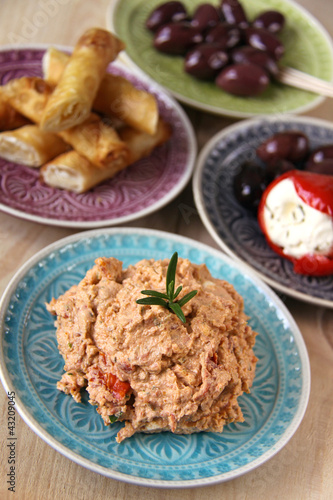 appetiser, appetiser, cream, paste, stuffed peppers, paprika, stuffed, cream cheese, olive, turkish, mediterranean, arabic, piquant, aromatic, sharp, finger food, snack, miscellaneous, distinct, choice, bread, plate, colourful, colourful, merry, turquoise, red, purple, green