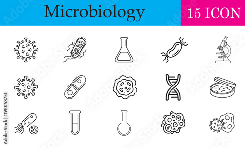 Microbiology Line Icon Set – Bacteria, Virus, Cells and Laboratory Outline Vector Icons