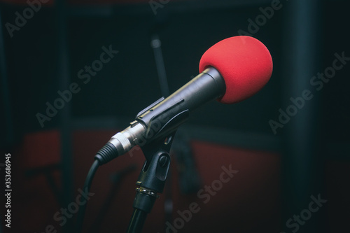 Microphone in the Studio on a stand on a dark background. Selective focus