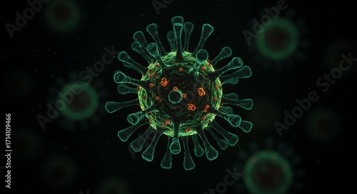 virus, microscopic, disease, pandemic, disease, infection, medicals, health care, research, science, virology, epidemic, outbreak, mobile phone, microbe, diagnosis, treatment, prevention, health, medicine, laboratory, microbiology, scientific, viral, contagious, spreading, crisis, global, vaccine, green, orange, membrane, rna, illustration, rendering, three-dimensional, isolated, black background