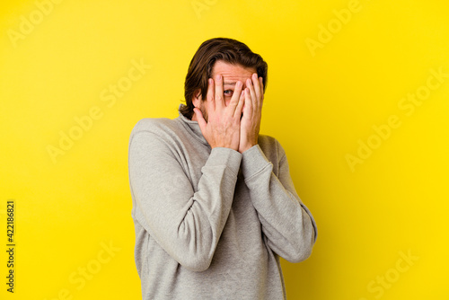Middle age caucasian man isolated on yellow background blink through fingers frightened and nervous.
