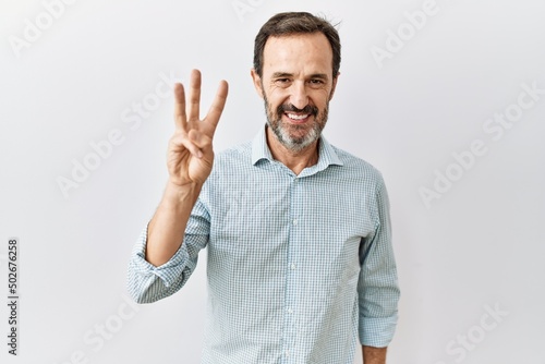 Middle age hispanic man with beard standing over isolated background showing and pointing up with fingers number three while smiling confident and happy.