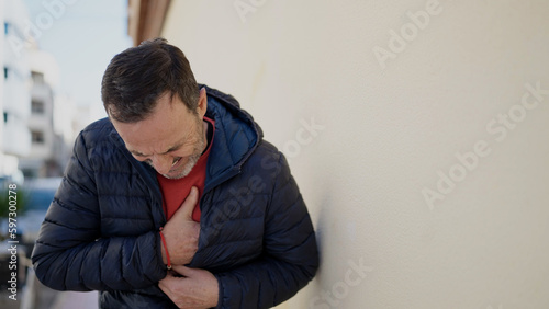 Middle age man suffering heart attack at street