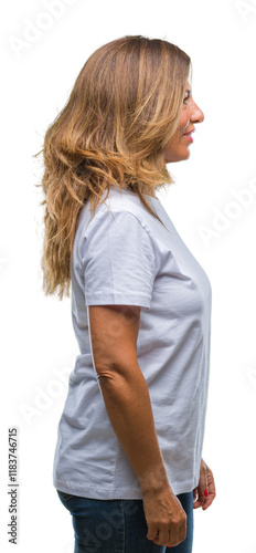 Middle age senior hispanic woman over isolated background looking to side, relax profile pose with natural face with confident smile.
