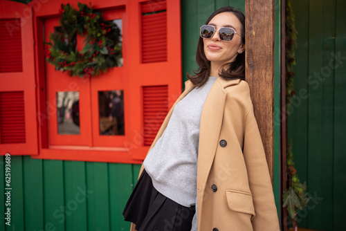 woman, winter, christmas, happy, adult, fashion, person, holiday, female, portrait, outdoors, smile, lifestyle, market, smiling, city, cheerful, season, festive, positive, happiness, decoration, outside, christmas decoration, coat, sunglasses, european, fashionable, traditional, stylish, christmas, attractive, merry, day, garland