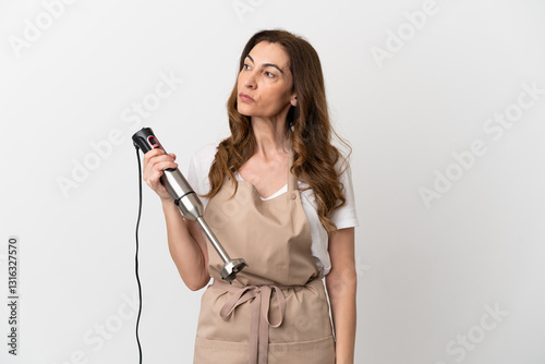 Middle aged caucasian woman using hand blender isolated on white background looking to the side