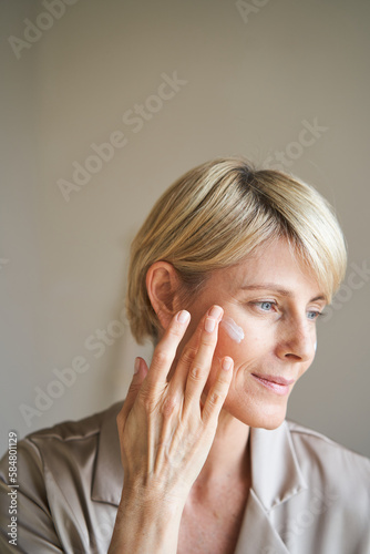 apply, bathroom, blond, cheek, copy space, cosmetic, cosmetology, cream, daily, delicate, dermatology, everyday, female, feminine, gentle, grey background, grooming, home, hydrate, hygiene, indoor, looking away, mature, moisture, morning, natural, nightwear, pajama, pamper, procedure, product, rejuvenate, short hair, silk, skincare, smear, smooth, soft, spa, tender, wall, well-being, wellness, woman