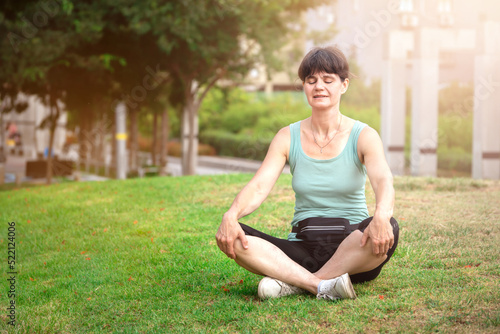 Middle aged smiling caucasian woman meditating or doing yoga on the grass in public park outdoors in summer sunny morning