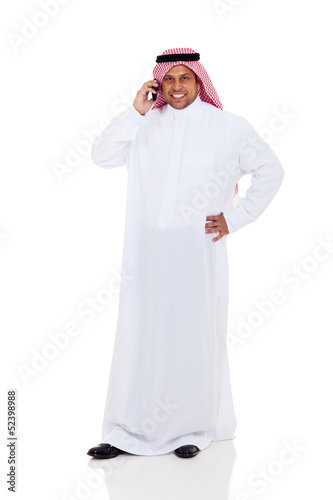 man, arabian, arabic, arab, saudi, muslim, talking, mobile phone, mobile, phone, answer, islam, middle eastern, robe, technology, isolated, white background, ethnic, male, businessman, cut-out, islamic, headscarf, traditional, photogenic, cute, smiling, smile, happy, cheerful, studio, young, adult, 30s, modern, full-length, clothing, clothes, ethnicity, confident, contemporary, white, standing