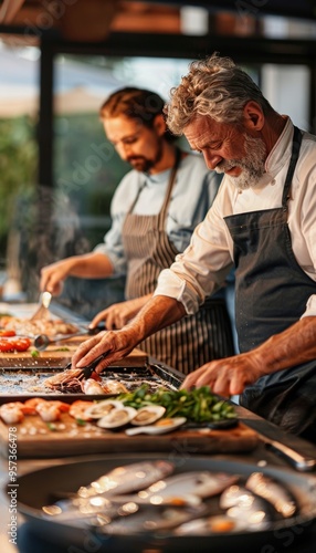 cooking, class, seafood, friends, chef, middle-aged, culinary, preparation, fresh, dish, teamwork, learning, tip, education, collaboration, kitchen, apron, ingredient, seafood, mussel, shrimp, lobster, workshop, group, gathering, hobby, gastronomy, cutting, slicing, professional, fun, togetherness, lifestyle, activity, cookery, enjoyment, knife