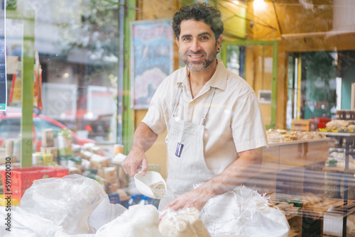 Middle-aged latin grain dealer seen through the glass of his store as he packs cereal into personal bags and looks at camera.