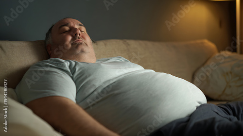 man, male, adult, middle-aged, caucasian, relax, nap, sleep, rest, comfort, peaceful, tranquil, serene, sofa, couch, home, indoor, living room, sleepy, exhausted, overweight, lazy, unhealthy, lifestyle, leisure, day off, weekend, closeup, horizontal, daylight, casual attire, t-shirt, alone, lonely, problem, dark, shadow, fatigue, pause, quiet, still, calm, to rest