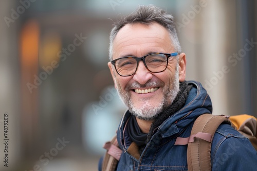 middle-aged man wearing glasses smiles and looks at camera, in the style of modern urban. generative AI