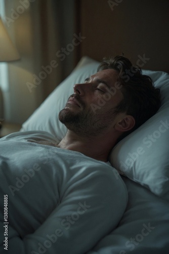digital, wellness, progressive, muscle, relaxation, man, middle-aged, closed, eye, bed, stress, relief, improve, sleep, routine, detox, calm, serene, peaceful, quiet, mindful, health, well-being, technology, free, unplug, indoor, home, bedchamber, european, adult, 1, person, lying, down, comfortable, cosy, night