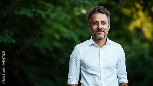man, middle-aged, short hair, white shirt, smiling, outdoors, green background, confident, nature, portrait, casual attire, mature, relaxed, adult